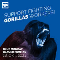 „wir, die Berliner Aktion gegen Arbeitgeberunrecht – BAGA – rufen zur Unterstützung des mutigen Kampfes der Gorillas-Kolleg:innen durch Teilnahme an ihren Aktionen und/oder durch Solidaritätserklärungen auf. Versenden wir unsere Solidaritätsadressen nicht nur an die Kolleg:innen (gorillasworkers@zohomail.com), sondern auch an ihren Arbeitgeber (hello@gorillasapp.com), um ihn direkt von der solidarischen Öffentlichkeit wissen zu lassen, ob nun verfaßt von Betriebsrats- oder Personalratsgremien, durch gewerkschaftliche Gliederungen, von Politiker*innen oder Einzelpersonen…“ Aufruf und Soli-Erklärung vom 12.6.21 der Berliner Aktion gegen Arbeitgeberunrecht